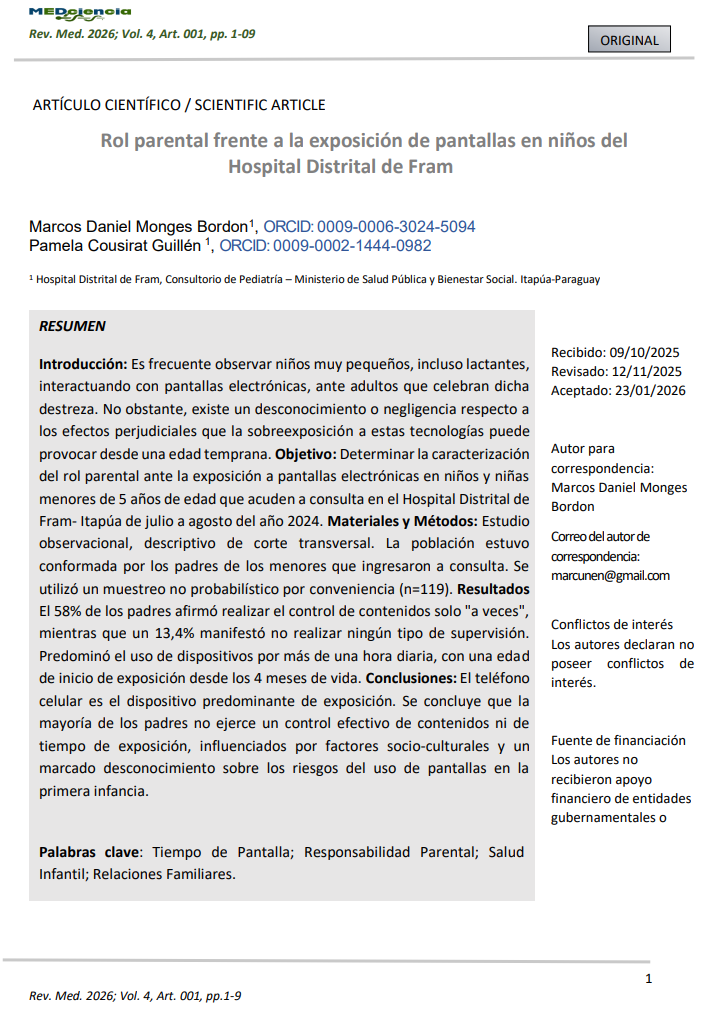 Objetivo: Determinar la caracterización del rol parental ante la exposición a pantallas electrónicas en niños y niñas menores de 5 años de edad que acuden a consulta en el Hospital Distrital de Fram- Itapúa de julio a agosto del año 2024.